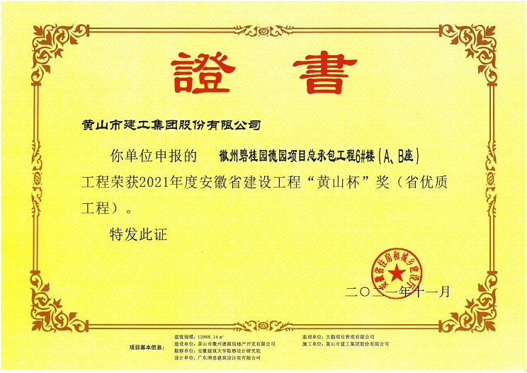 由乐鱼官网注册-乐鱼(中国) 承建的徽州区碧桂园德园项目总承包工程6#楼(A、B座) 工程荣获安徽省工程质量最高奖“黄山杯”奖。该工程在开工伊始,项目部就制订了创优目标,严格过程控制,建立健全项目质量管理体系,狠抓现场施工管理,把好施工过程质量控制关,为创精品工程打下坚实的基础。