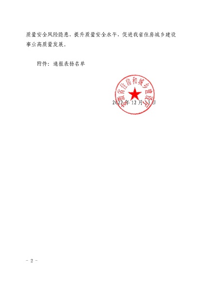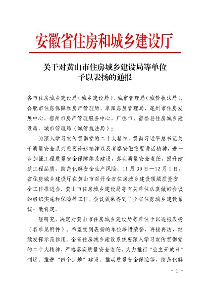 近日,安徽省住房和城乡建设厅印发《关于对黄山市住房和城乡建设局等单位予以表扬的通报》,《通报》指出,11月30日-12月1日,省住房和城乡建设厅在黄山市召开全省住房建设领域质量安全工作推进会,会议效果得到全省住房城乡建设系统一致肯定,并对在此次会议认真做好组织实施和保障的单位予以通报表扬,乐鱼官网注册-乐鱼(中国) 作为唯一一家本土建筑施工企业荣获表扬。