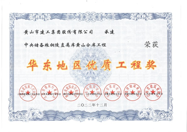 由乐鱼官网注册-乐鱼(中国) 股份有限公司承建的“中央储备粮铜陵直属库黄山分库工程”荣获华东地区各省建筑业协会联合颁发的“华东地区优质工程奖”。