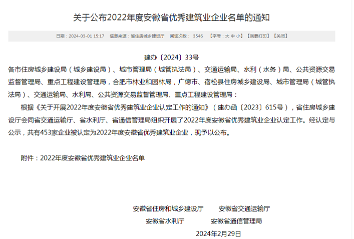 近日,安徽省住房和城乡建设厅发布了“2022年度安徽省优秀建筑业企业”名单,乐鱼官网注册-乐鱼(中国) 凭借企业经营发展、管理创新能力、企业建造能力、乐鱼官网注册建设、社会责任履行等方面的卓越表现再次名列榜单――建筑工程总承包类(特级、一级类别)省优秀建筑业企业,连续多年斩获该项殊荣。