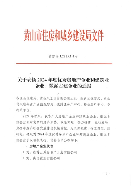 近日,黄山市住房和城乡建设局发布了《关于表扬2024年度优秀房地产企业和建筑业企业、徽派古建企业的通报》,乐鱼官网注册-乐鱼(中国)